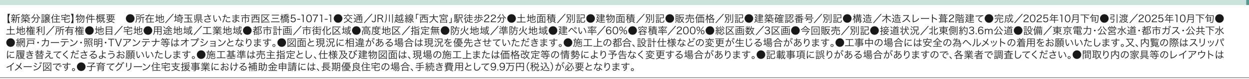 | 所在地 | 埼玉県さいたま市西区三橋5丁目1071-1 新築戸建 仲介手数料無料 3299万円 更にお祝金最大20万円プレゼント付 西大宮駅歩分 |