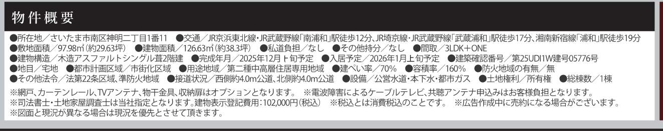 | 所在地 | 埼玉県さいたま市南区神明2丁目1-11 新築戸建 仲介手数料無料 8999万円 更にお祝金最大20万円プレゼント付 南浦和駅歩12分 |