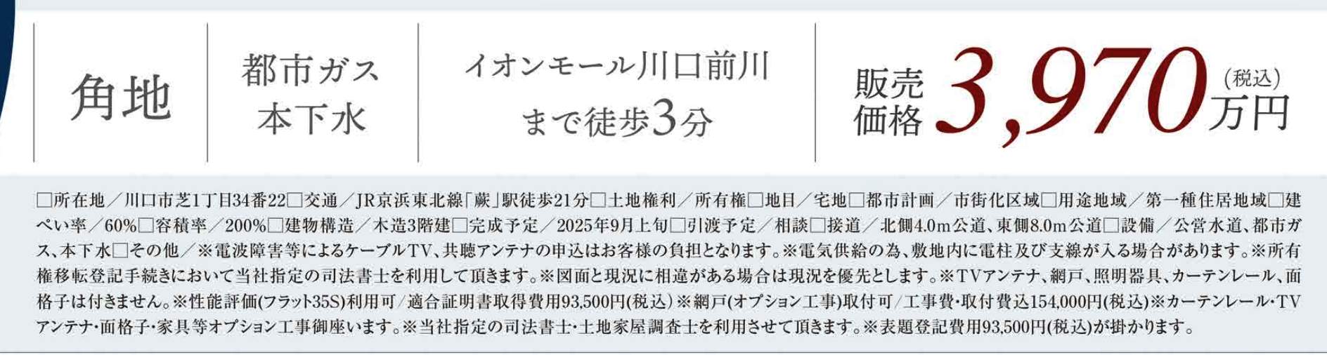 | 所在地 | 埼玉県川口市芝1丁目34-10 新築戸建 仲介手数料無料 3970万円 更にお祝金最大20万円プレゼント付 蕨駅歩21分 |