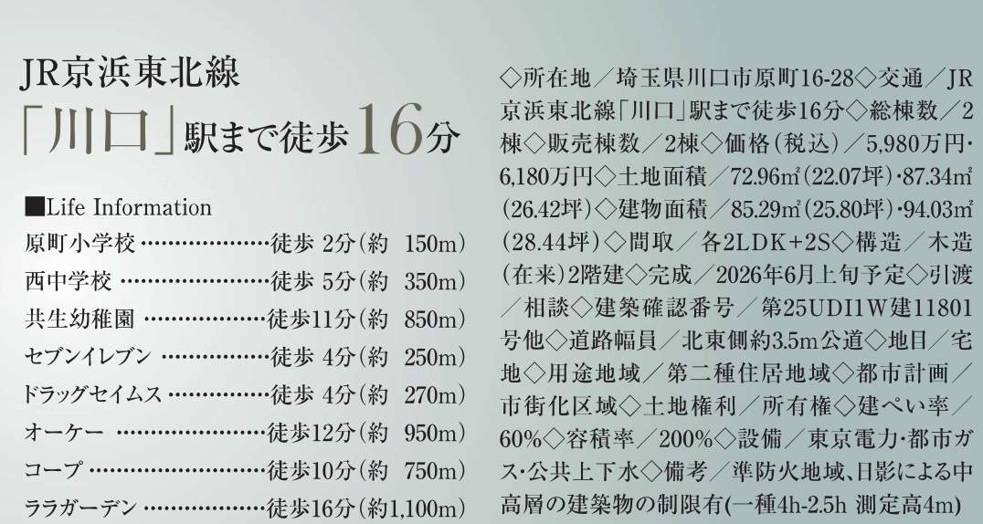 | 所在地 | 埼玉県川口市原町16-28 新築戸建 仲介手数料無料 6080万円 更にお祝金最大20万円プレゼント付 川口駅歩16分 |