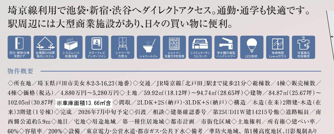 戸田市美女木2丁目 新築戸建 仲介手数料無料 4780万円より値下げ!4棟 更にお祝金最大20万円プレゼント付 北戸田駅歩21分 新築戸建