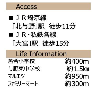 | 交通 | JR埼京線北与野駅 徒歩11分 JR京浜東北・根岸線大宮駅 徒歩15分 |