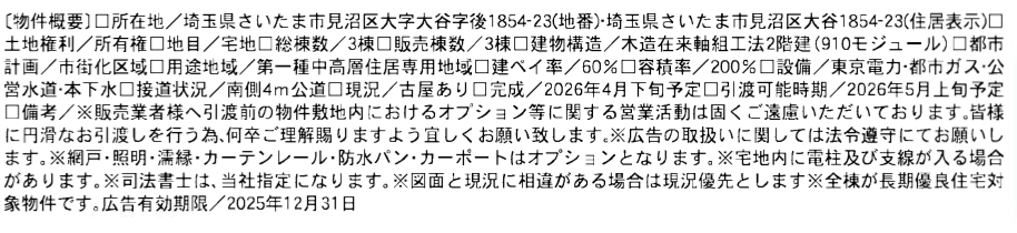 | 所在地 | 埼玉県さいたま市見沼区大字大谷1854-23 新築戸建 仲介手数料無料 3680万円 更にお祝金最大20万円プレゼント付 七里駅歩21分 |