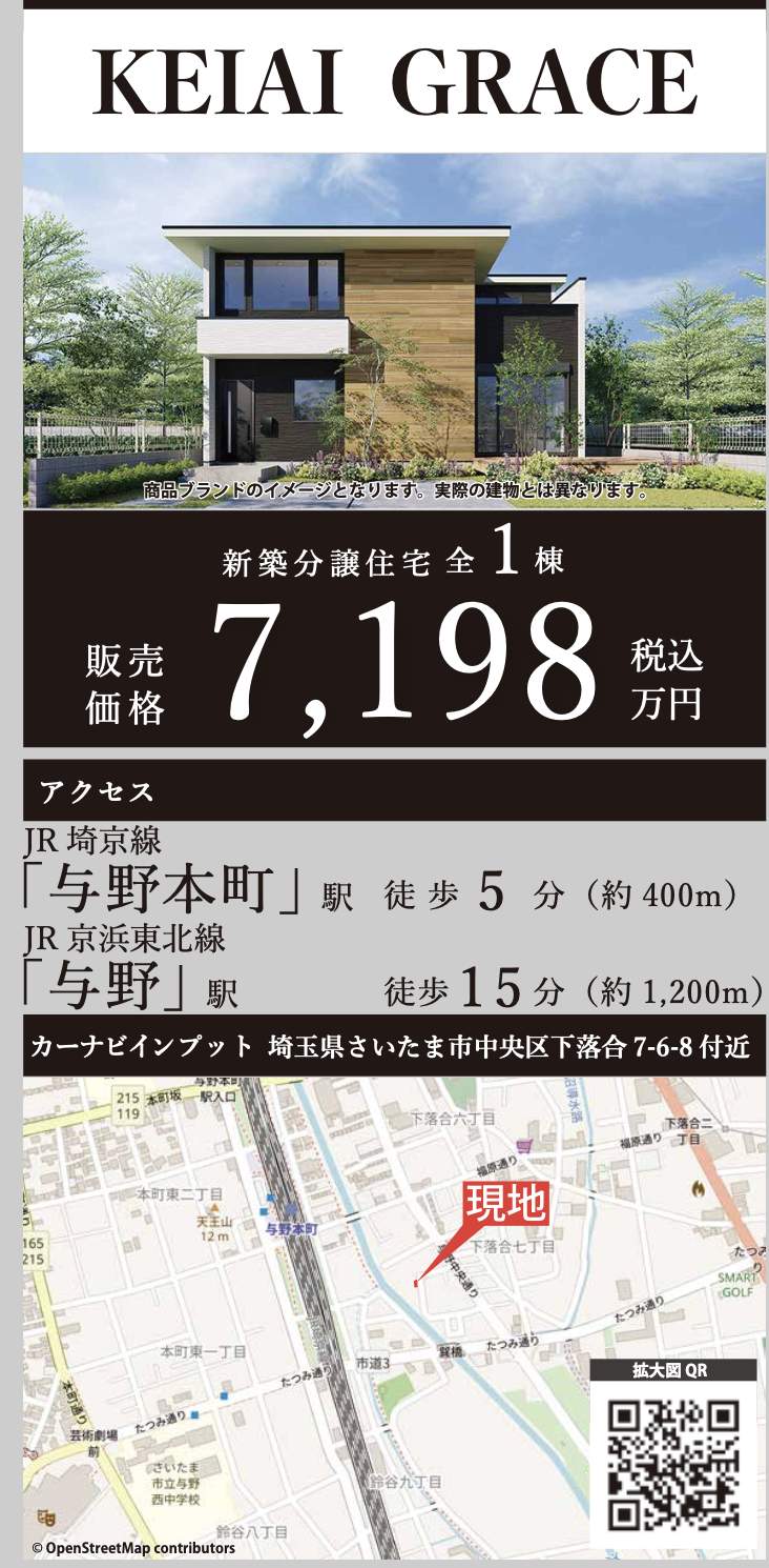 | 所在地 | 埼玉県さいたま市中央区下落合7丁目6-8 新築戸建 仲介手数料無料 7198万円 更にお祝金最大20万円プレゼント付 与野本町駅歩5分 |