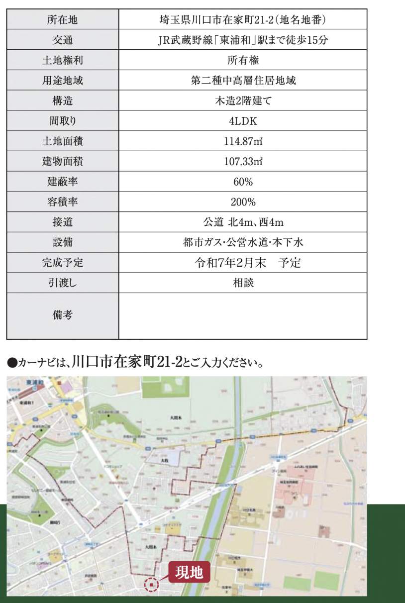 | 所在地 | 埼玉県川口市在家町 21-2新築戸建 仲介手数料無料 5380万円 更にお祝金最大20万円プレゼント付 東浦和駅歩15分 |