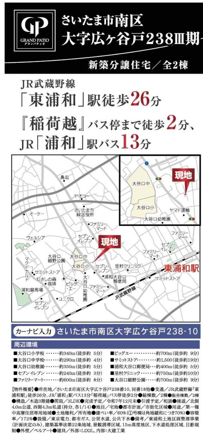 | 所在地 | 埼玉県さいたま市南区大字広ヶ谷戸238-10 新築戸建 仲介手数料無料 3380万円 更にお祝金最大20万円プレゼント付 東浦和駅歩26分 |