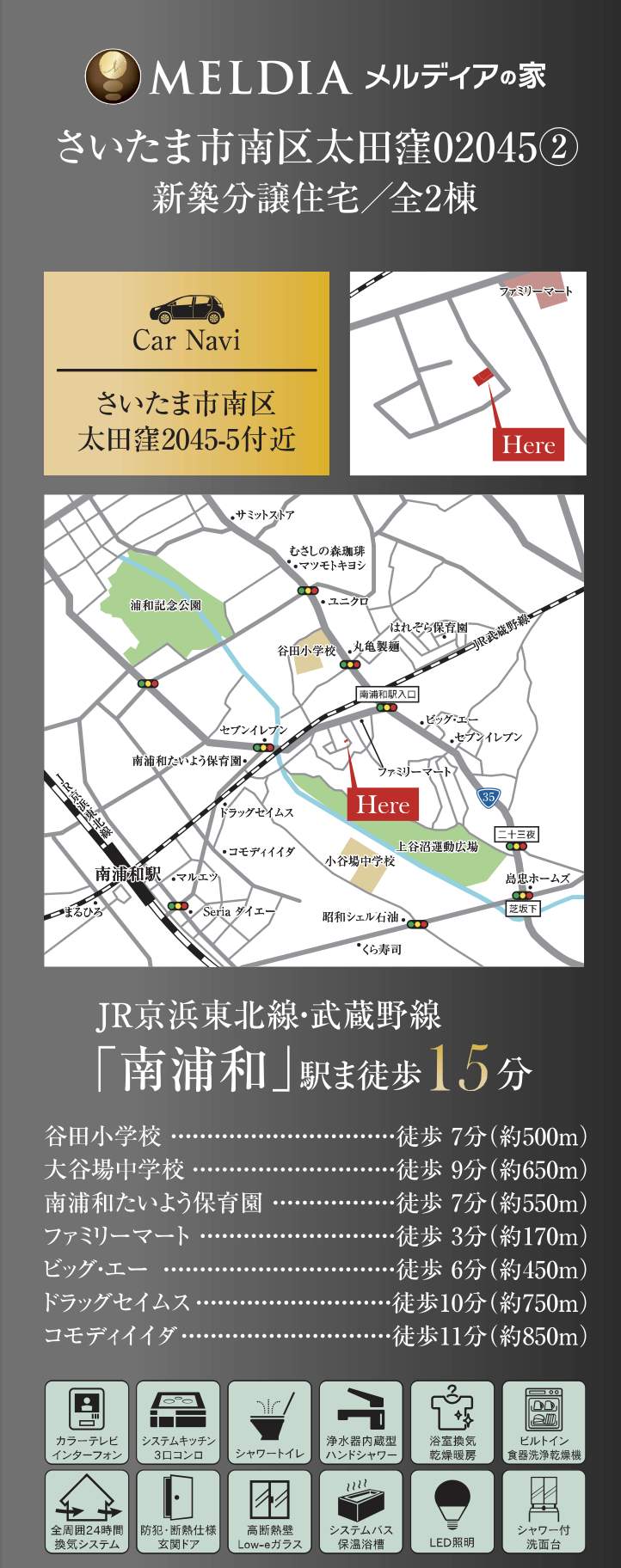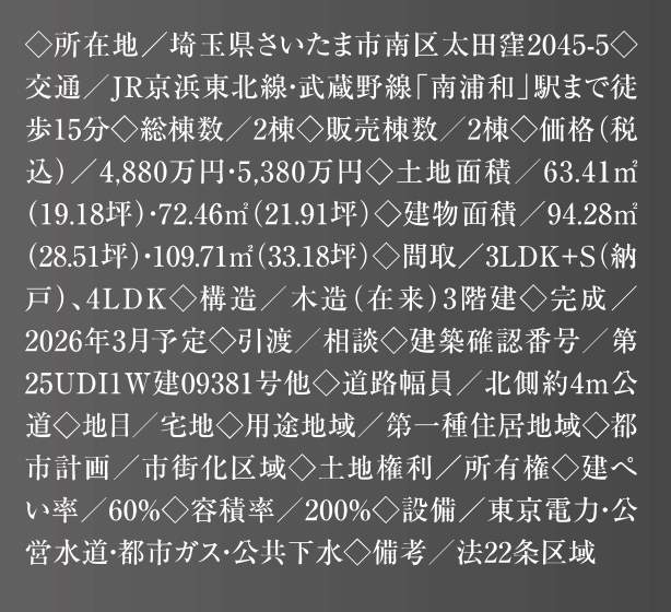 所在地 埼玉県さいたま市南区別所2丁目4-7 新築戸建 仲介手数料無料 8799万円 更にお祝金最大20万円プレゼント付 武蔵浦和駅歩8分