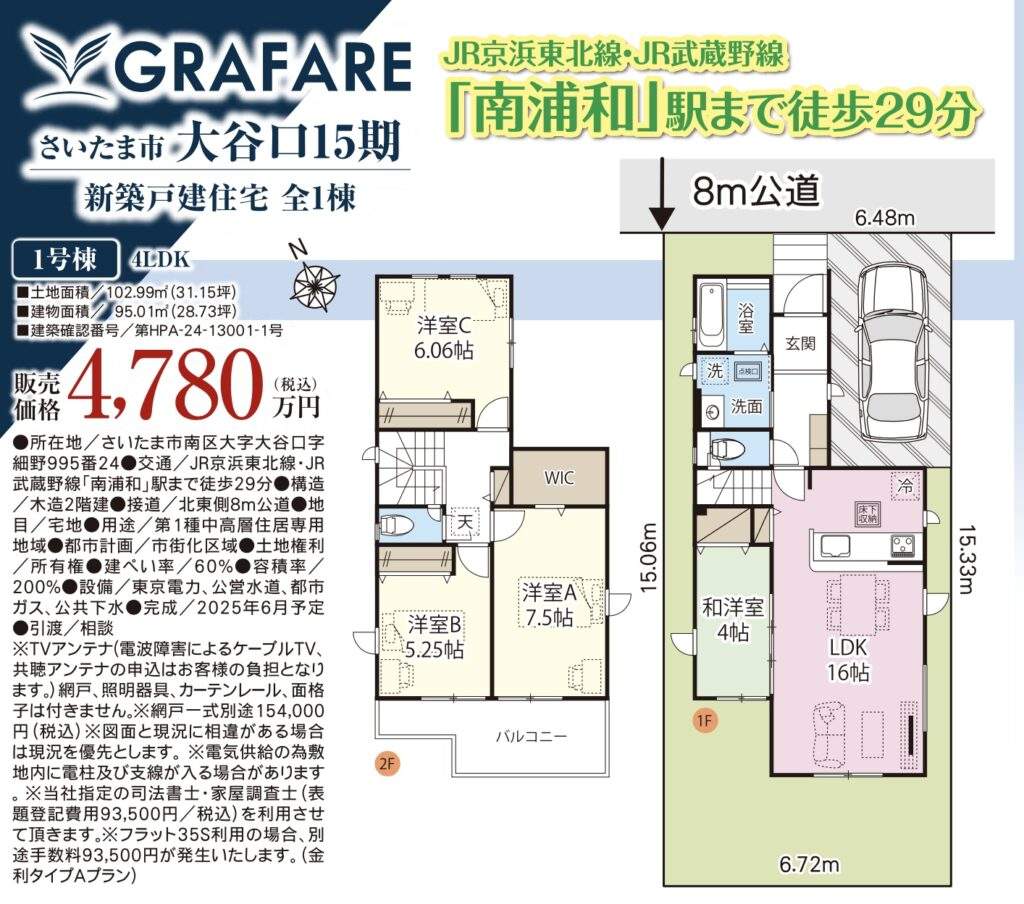 さいたま市見沼区大和田町2丁目 新築戸建 仲介手数料無料 3980万円より 更に祝金最大20万円プレゼント付 大和田駅歩14分 新築戸建