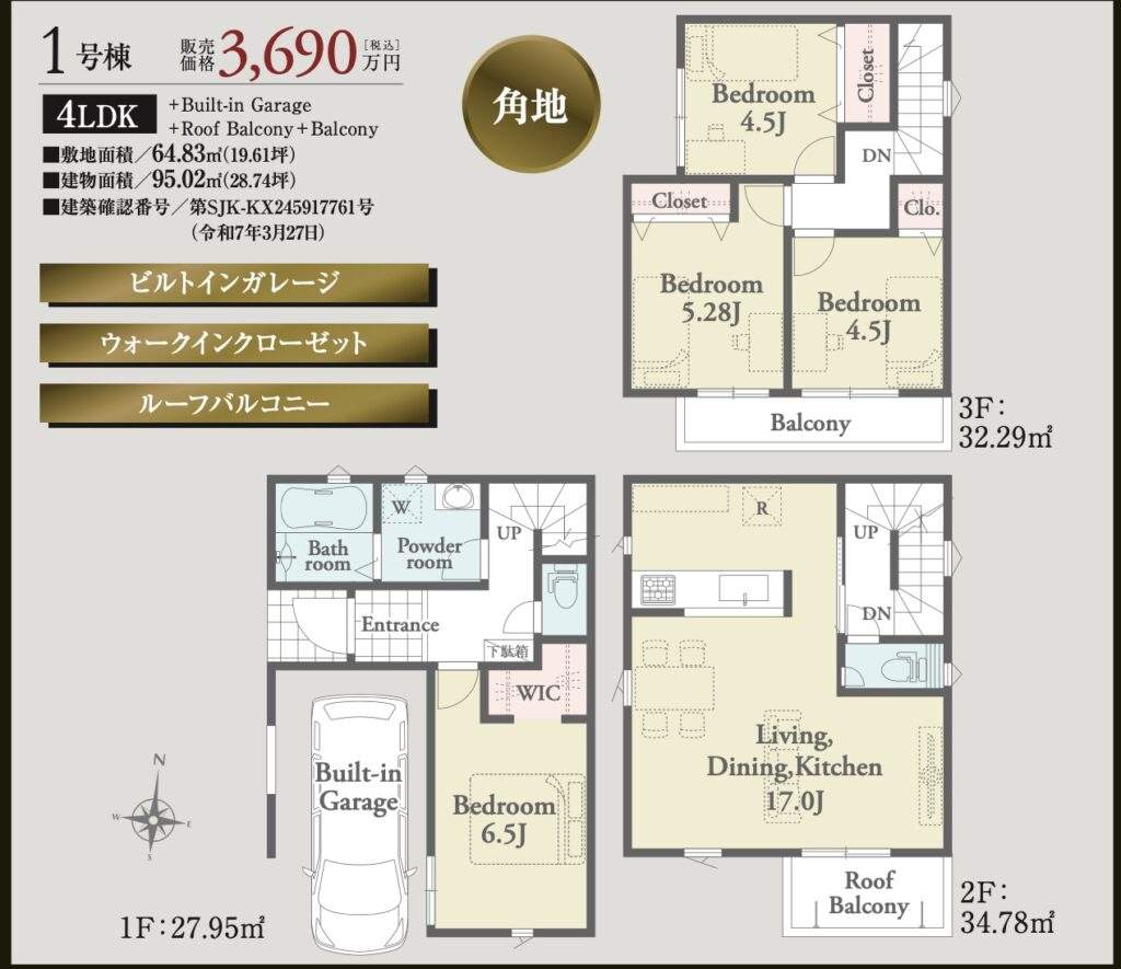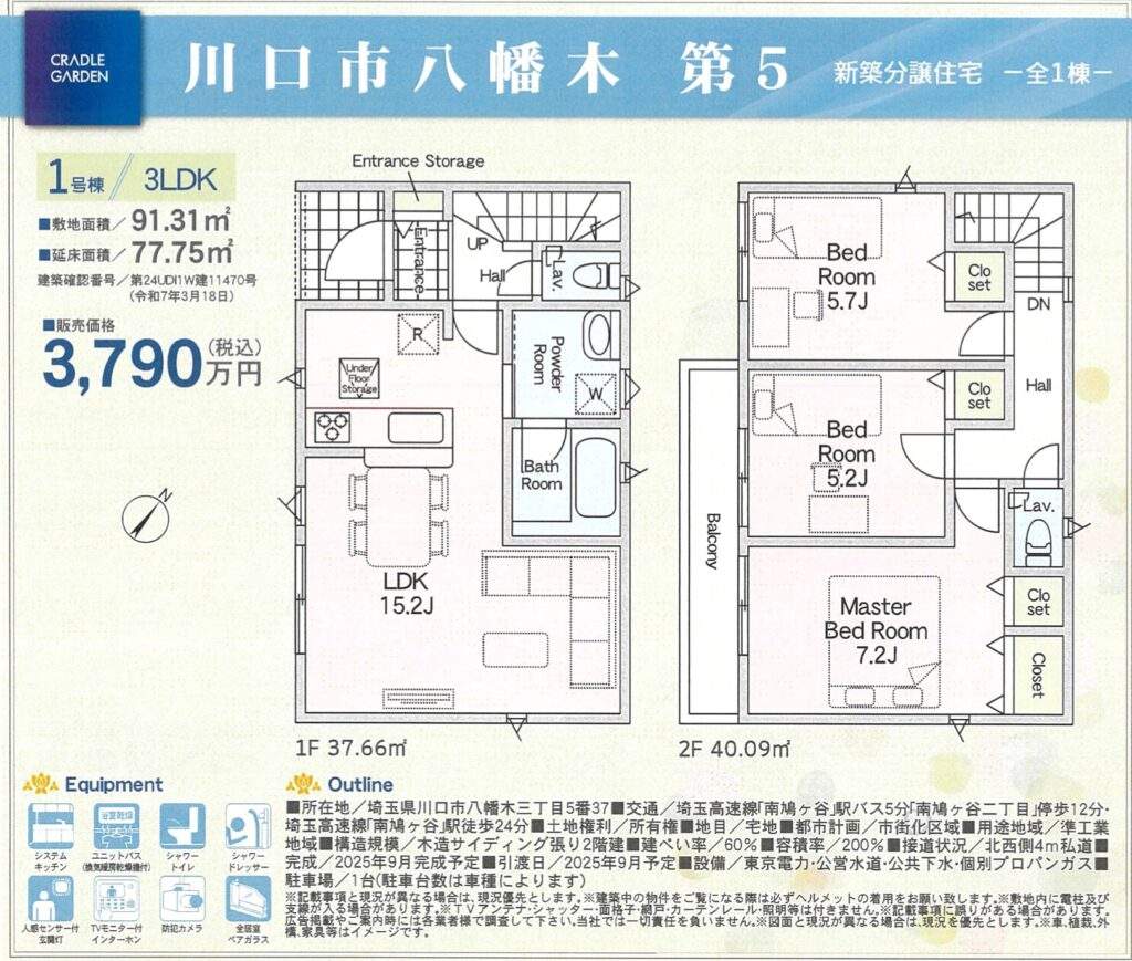 川口市朝日6丁目 新築戸建 仲介手数料無料 3780万円 屋上庭園 更にお祝金最大20万円プレゼント付 南鳩ヶ谷駅歩18分 新築戸建