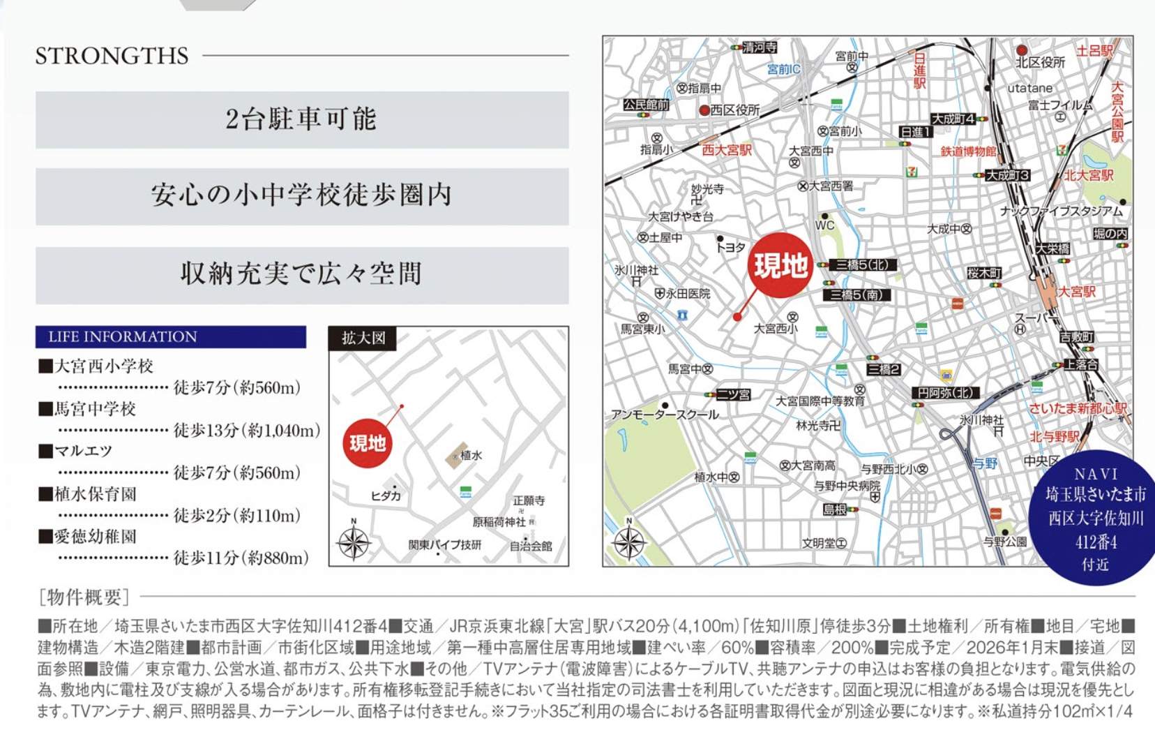 所在地 埼玉県さいたま市西区大字佐知川412-4 新築戸建 仲介手数料無料 3490万円 更にお祝金最大20万円プレゼント付 大宮駅歩分
