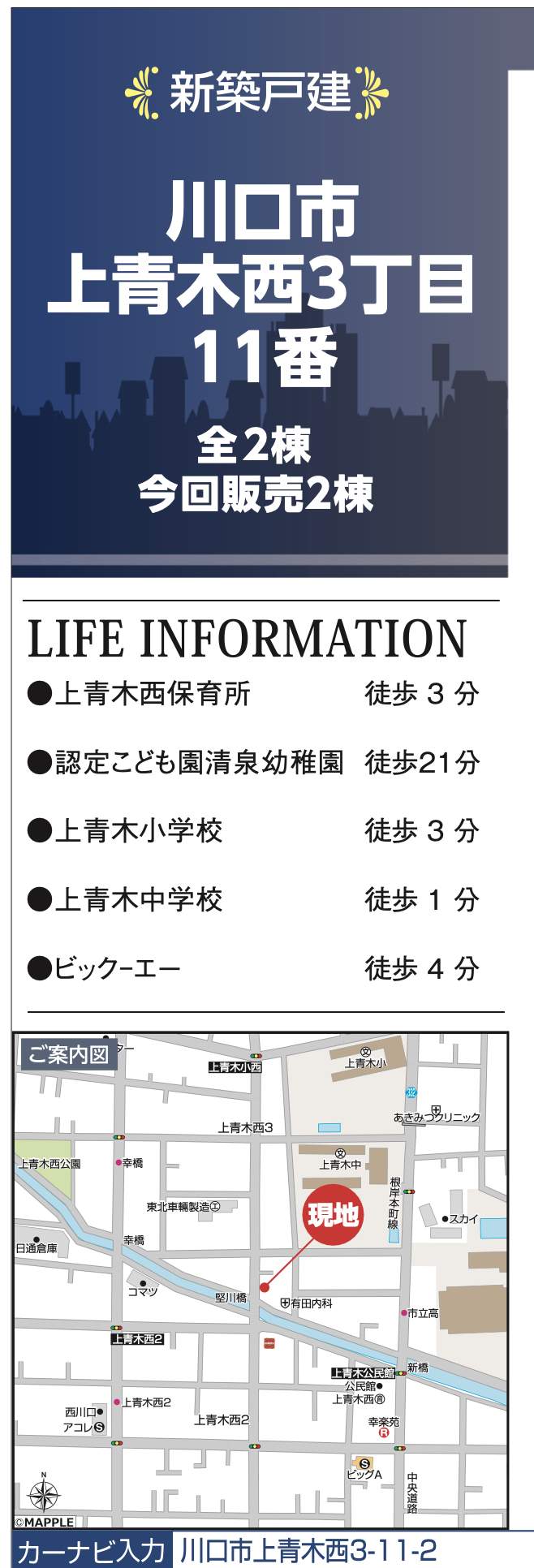 | 所在地 | 埼玉県川口市上青木西3丁目11-2 新築戸建 仲介手数料無料 4590万円 更にお祝金最大20万円プレゼント付 西川口駅歩分 |
