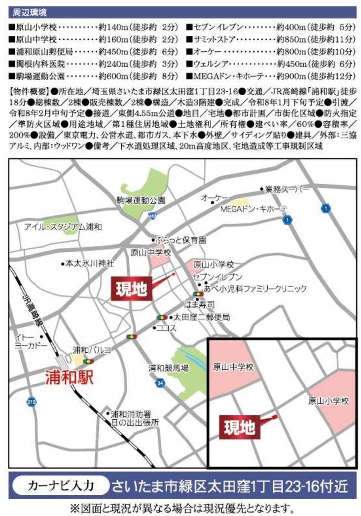 | 所在地 | 埼玉県さいたま市緑区太田窪1丁目23-16 新築戸建 仲介手数料無料 5980万円 更にお祝金最大20万円プレゼント付 浦和駅歩18分 |