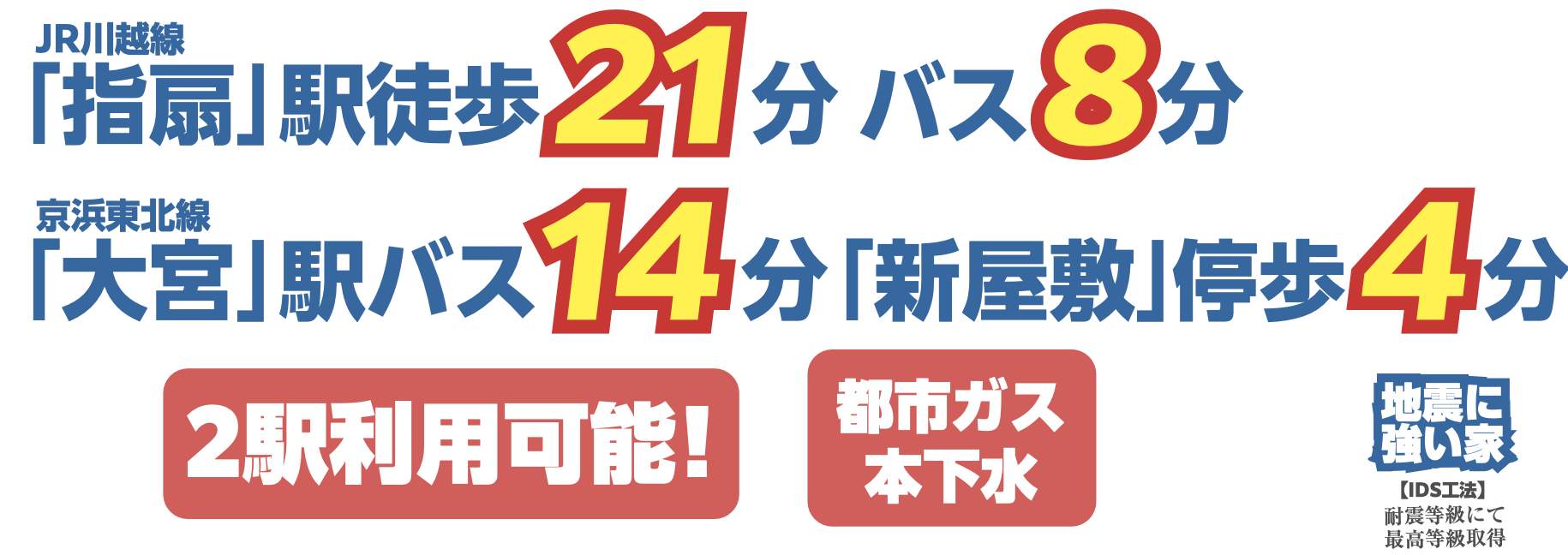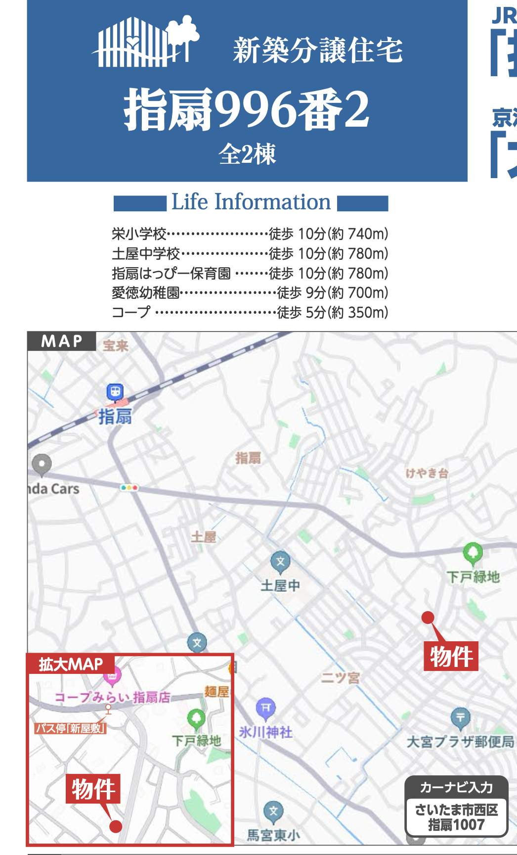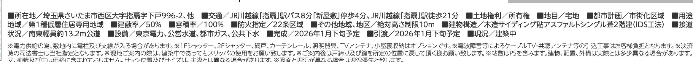 | 交通 | JR川越線指扇駅 徒歩21分 バス(新屋敷 乗8分 停歩4分) JR京浜東北・根岸線大宮駅 バス(新屋敷 乗14分 停歩4分) |