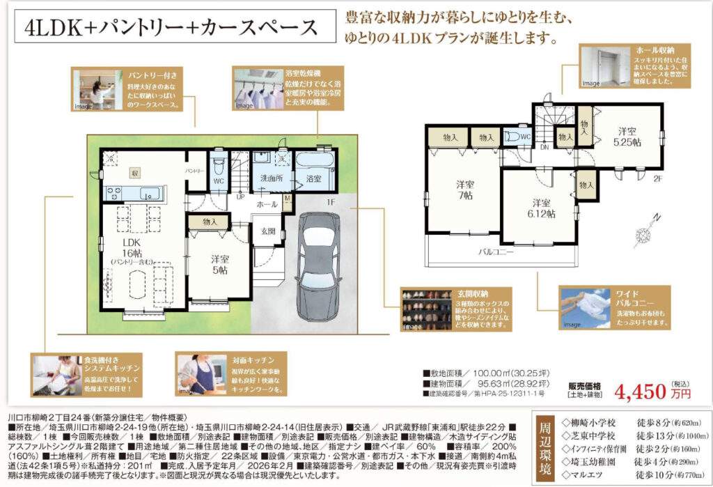 | 所在地 | 埼玉県川口市柳崎2丁目24-14 新築戸建 仲介手数料無料 4450万円 更にお祝金最大20万円プレゼント付 東浦和駅歩22分 |
