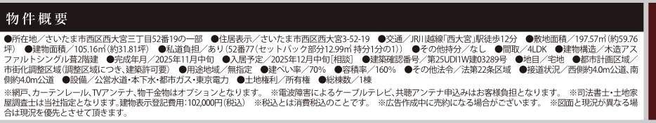 | 所在地 | 埼玉県さいたま市西区西大宮3丁目52-19 新築戸建 仲介手数料無料 5699万円 更にお祝金最大20万円プレゼント付 西大宮駅歩12分 |