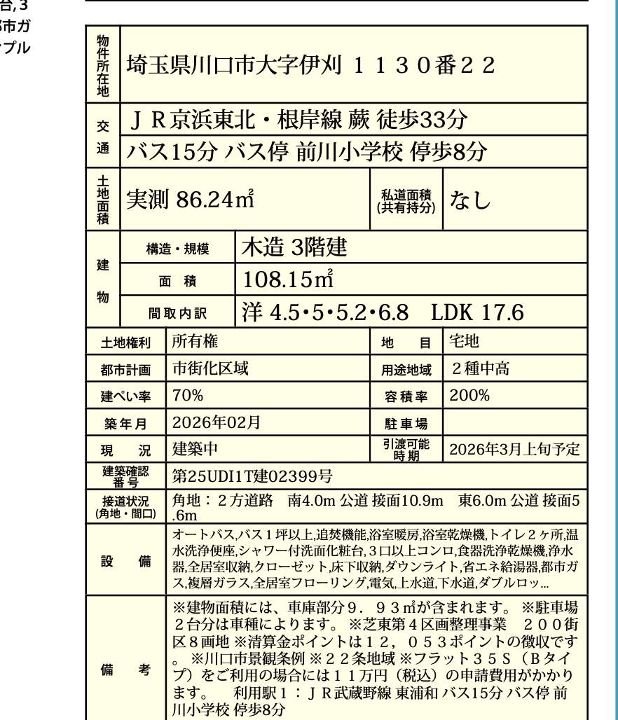 | 所在地 | 埼玉県川口市大字伊刈1130-22 新築戸建 仲介手数料無料 4280万円 更にお祝金最大20万円プレゼント付 蕨駅歩分 |