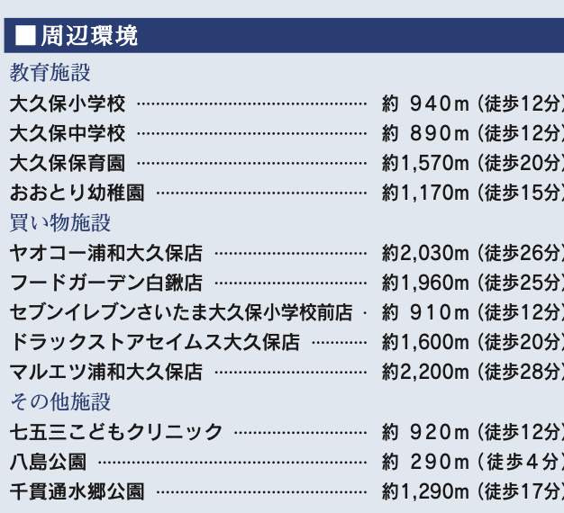 | 交通 | JR京浜東北・根岸線浦和駅 バス(やつしまニュータウン 乗36分 停歩6分) JR京浜東北・根岸線北浦和駅 バス(大久保支所 乗29分 停歩12分) |