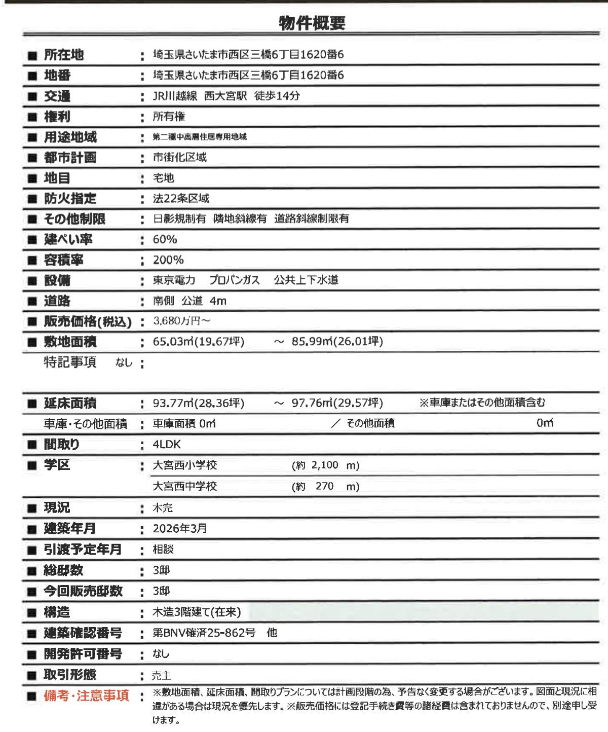 さいたま市西区三橋6丁目 新築戸建 仲介手数料無料 3480万円より 更にお祝金最大20万円プレゼント付 西大宮駅歩14分 新築戸建