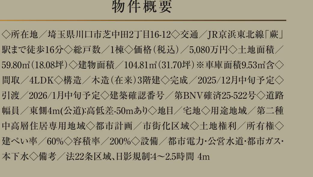 | 所在地 | 埼玉県川口市芝中田2丁目16-12 新築戸建 仲介手数料無料 4980万円 更にお祝金最大20万円プレゼント付 蕨駅歩16分 |