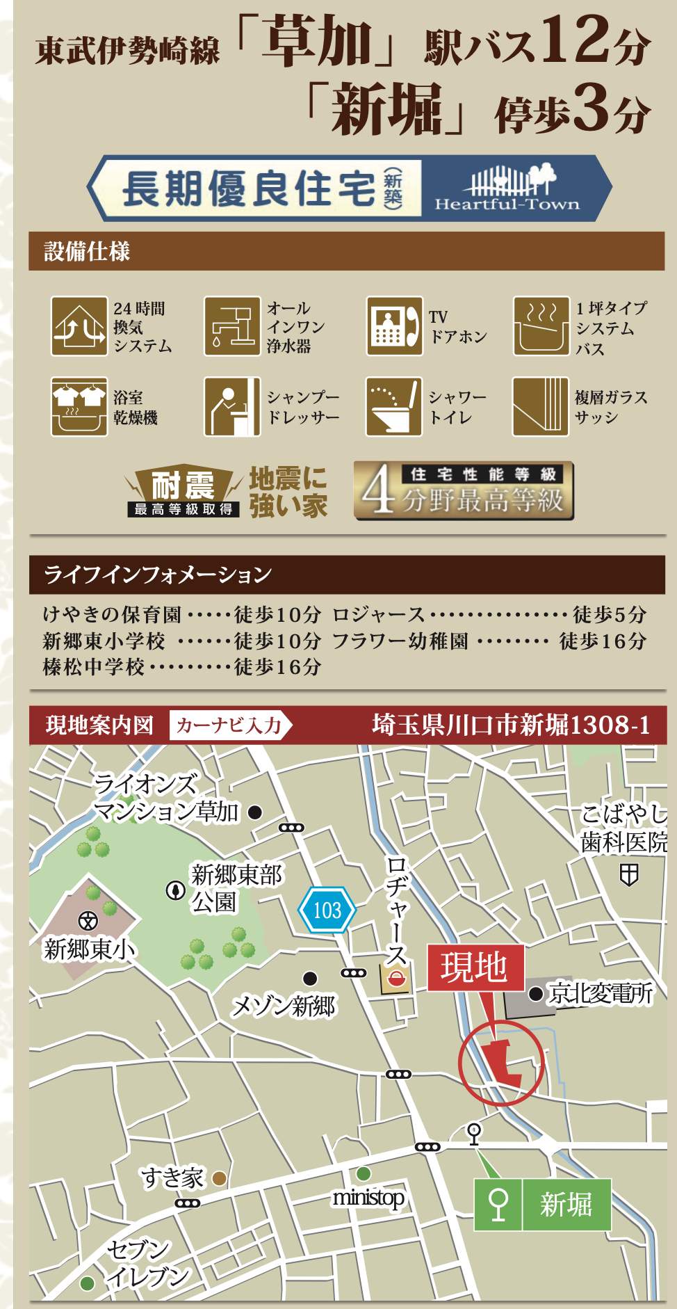 | 交通 | 東武伊勢崎線草加駅 バス(新堀 乗12分 停歩3分) |