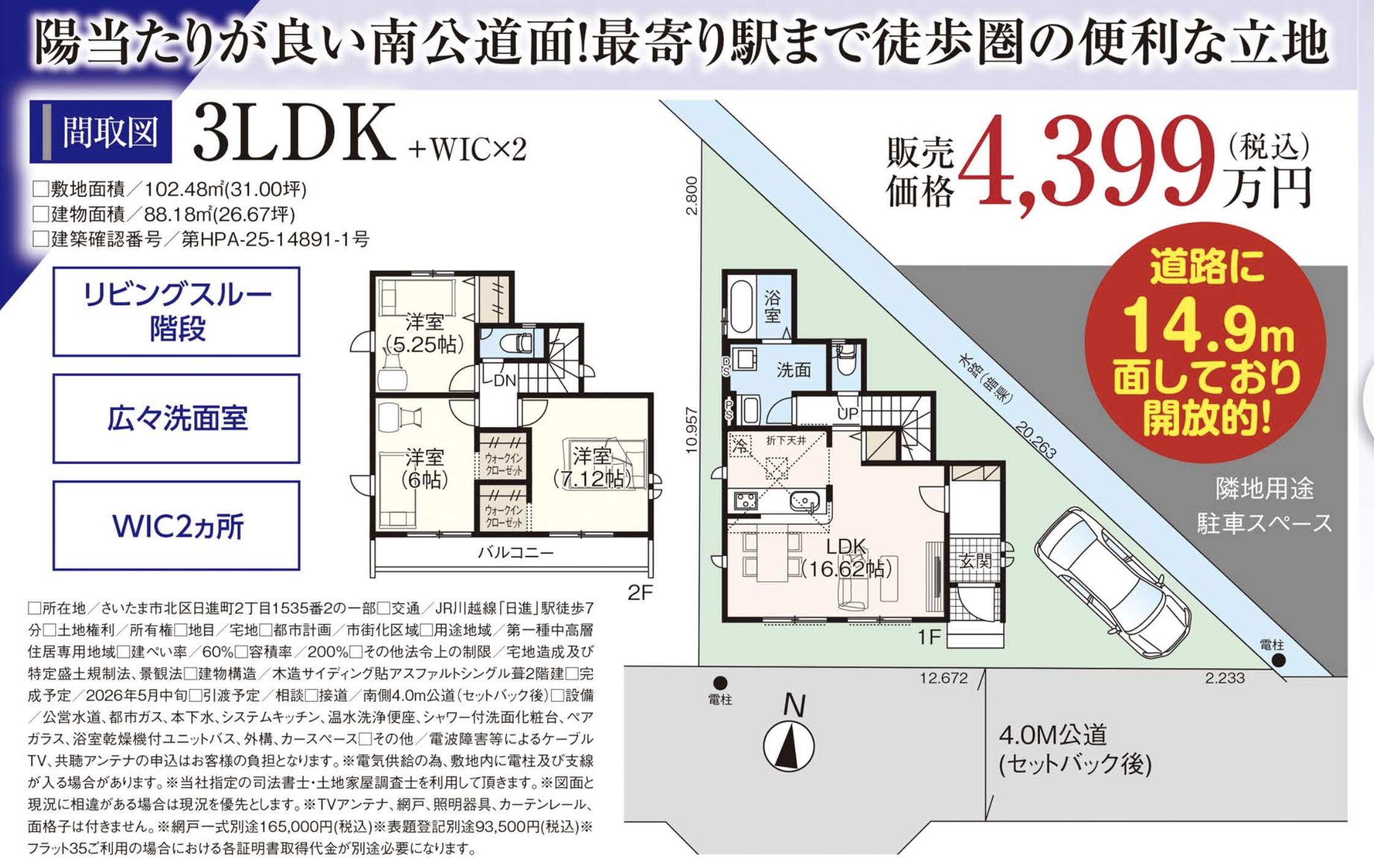さいたま市北区日進町2丁目 新築戸建 仲介手数料無料 4399万円 更にお祝金最大20万円プレゼント付 日進駅歩7分 新築戸建