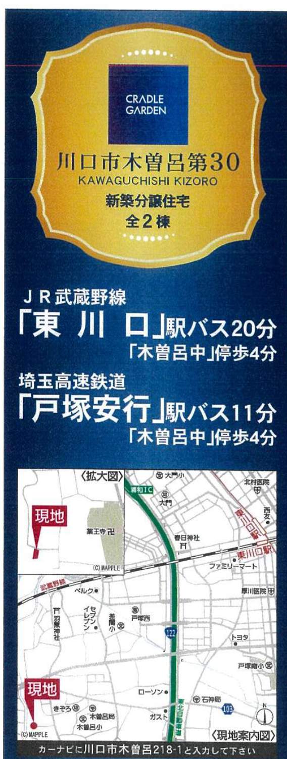 川口市大字木曽呂 新築戸建 仲介手数料無料 3280万円より2棟 更にお祝金最大20万円プレゼント付 東川口駅 バス(木曽呂中 乗20分 停歩4分) 新築戸建