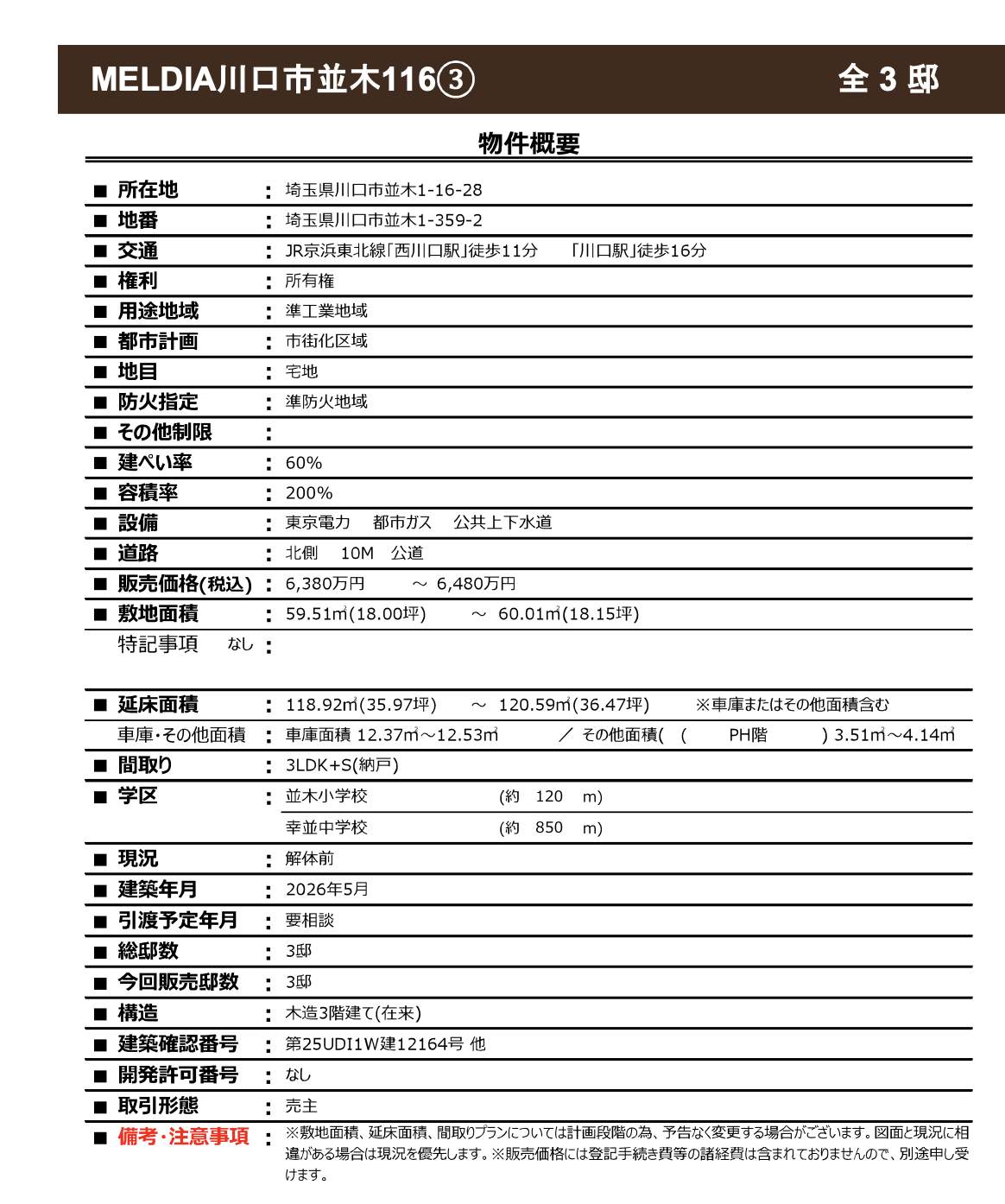 川口市並木1丁目 新築戸建 仲介手数料無料 6380万円より3棟 更にお祝金最大20万円プレゼント付 西川口駅歩11分 新築戸建