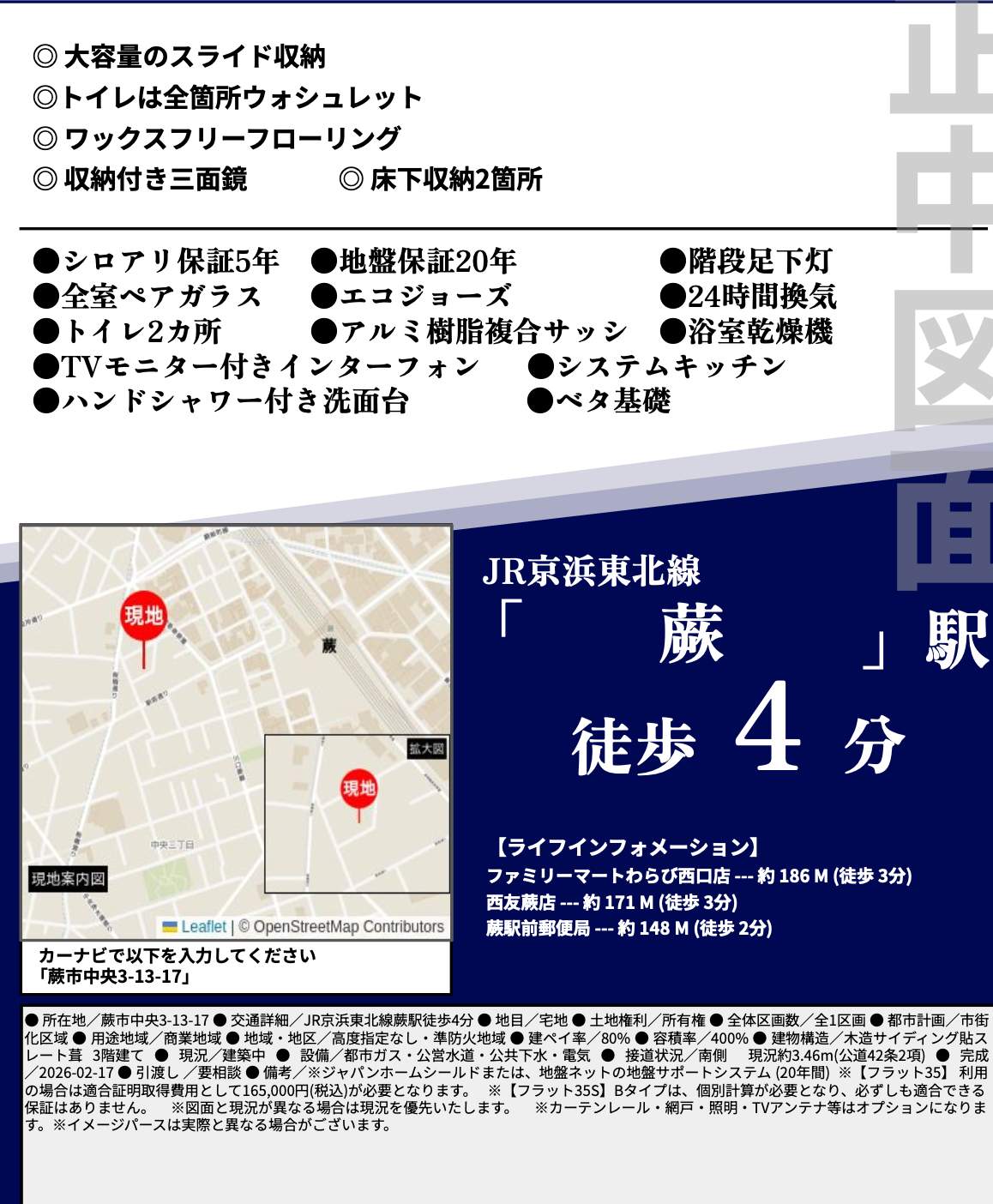| 所在地 | 埼玉県蕨市中央3丁目13-17 新築戸建 仲介手数料無料 5680万円 更にお祝金最大20万円プレゼント付 蕨駅歩4分 |