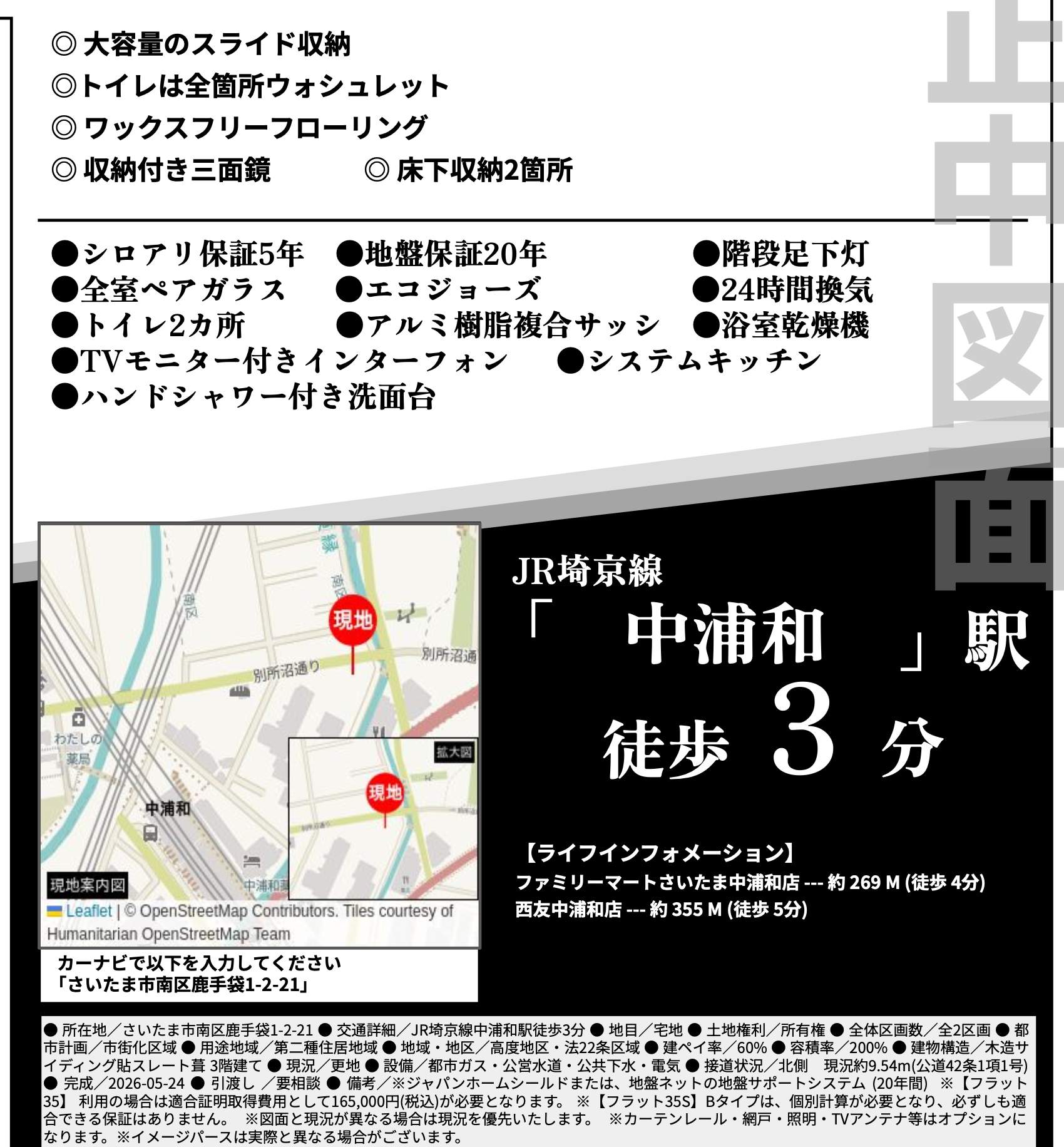 所在地 埼玉県さいたま市南区鹿手袋1丁目2-21 新築戸建 仲介手数料無料 5480万円 更にお祝金最大20万円プレゼント付 中浦和駅歩分