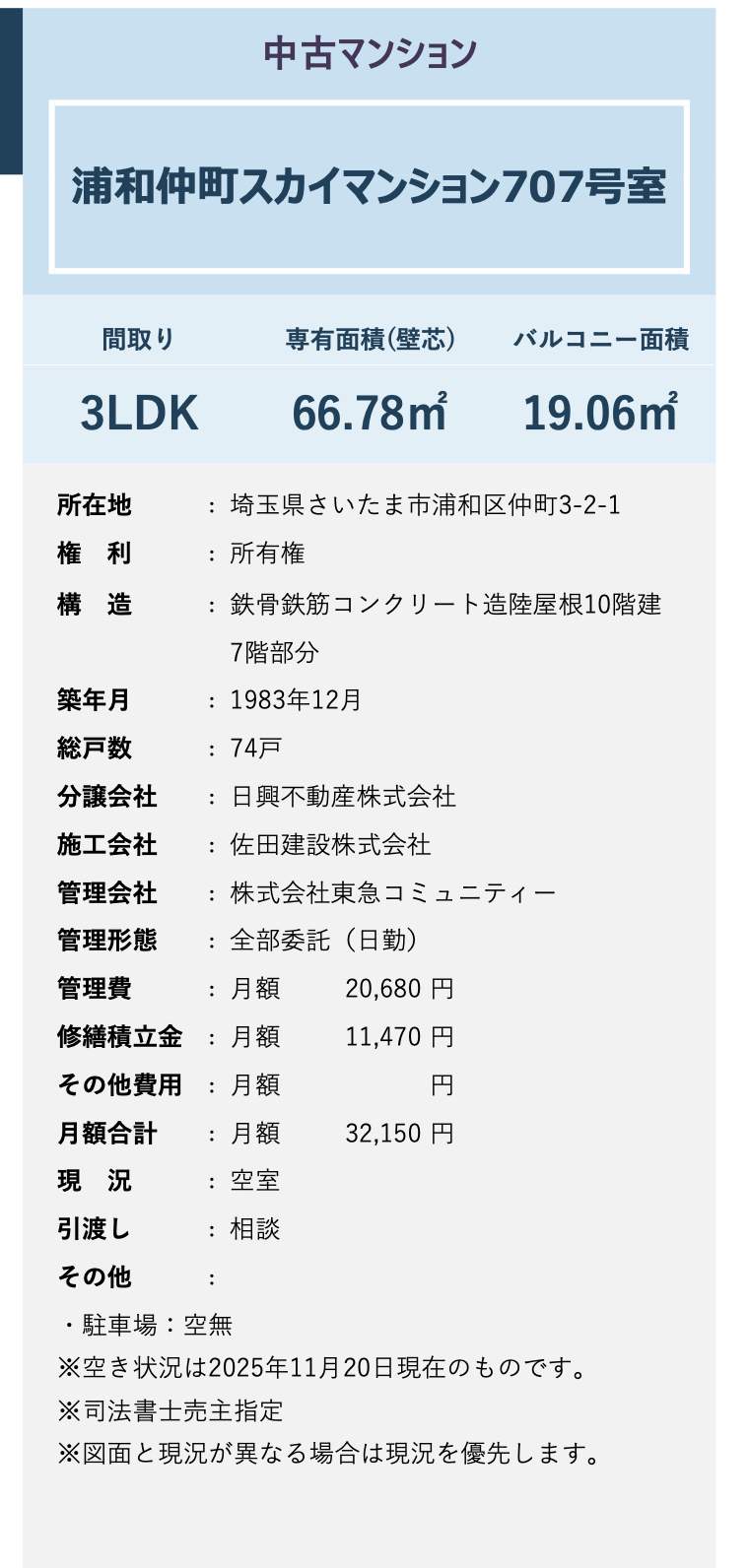 浦和仲町スカイマンション 仲介手数料無料 中古マンション