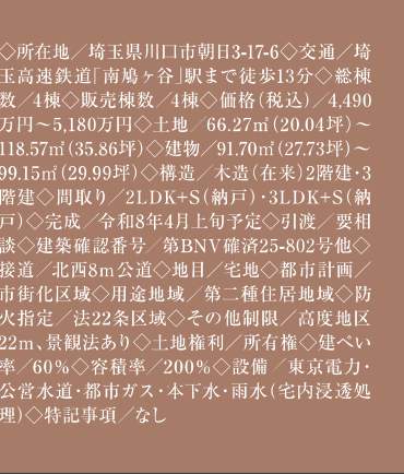 川口市朝日3丁目 新築戸建 仲介手数料無料 4480万円より5棟 更にお祝金最大20万円プレゼント付 南鳩ヶ谷駅歩13分 新築戸建