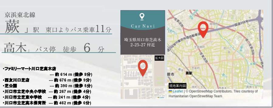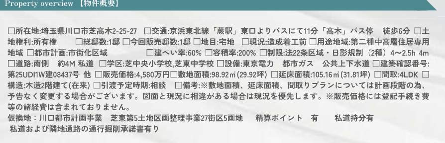 | 所在地 | 埼玉県川口市芝高木2丁目25-27 新築戸建 仲介手数料無料 4460万円 更にお祝金最大20万円プレゼント付 蕨駅歩分 |