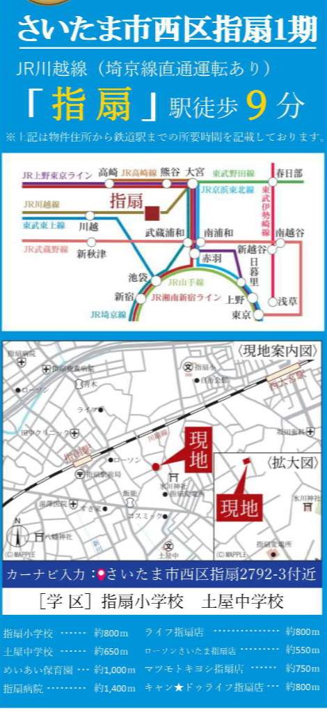 | 所在地 | 埼玉県さいたま市西区大字指扇2792-3 新築戸建 仲介手数料無料 4499万円 更にお祝金最大20万円プレゼント付 指扇駅歩9分 |