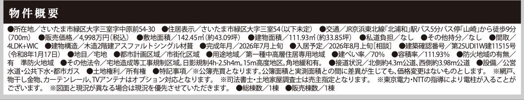 | 所在地 | 埼玉県さいたま市緑区大字三室54-30 新築戸建 仲介手数料無料 4998万円 更にお祝金最大20万円プレゼント付 北浦和駅歩分 |