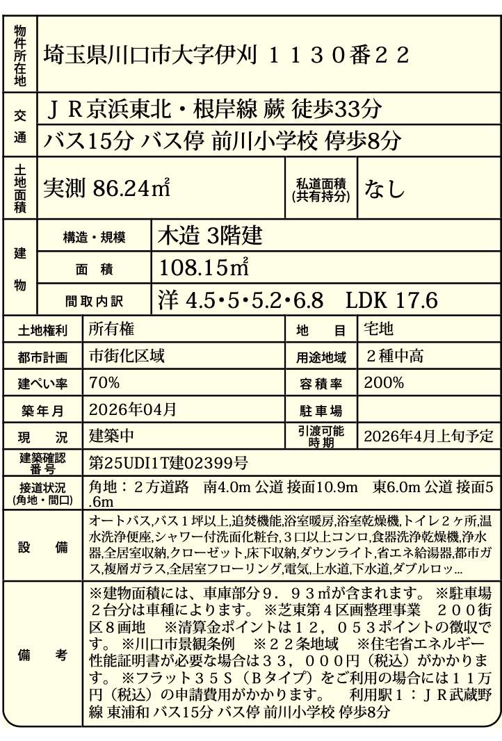 | 交通 | JR京浜東北・根岸線蕨駅 徒歩33分 バス(前川小学校 乗15分 停歩8分) |