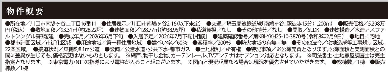 | 所在地 | 埼玉県川口市南鳩ヶ谷2丁目16-2 新築戸建 仲介手数料無料 5298万円 更にお祝金最大20万円プレゼント付 南鳩ヶ谷駅歩15分 |