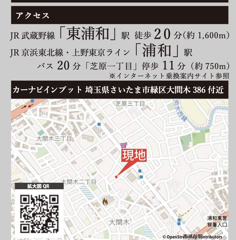 | 交通 | JR武蔵野線東浦和駅 徒歩20分 JR京浜東北・根岸線浦和駅 バス(芝原一丁目 乗20分 停歩11分) |