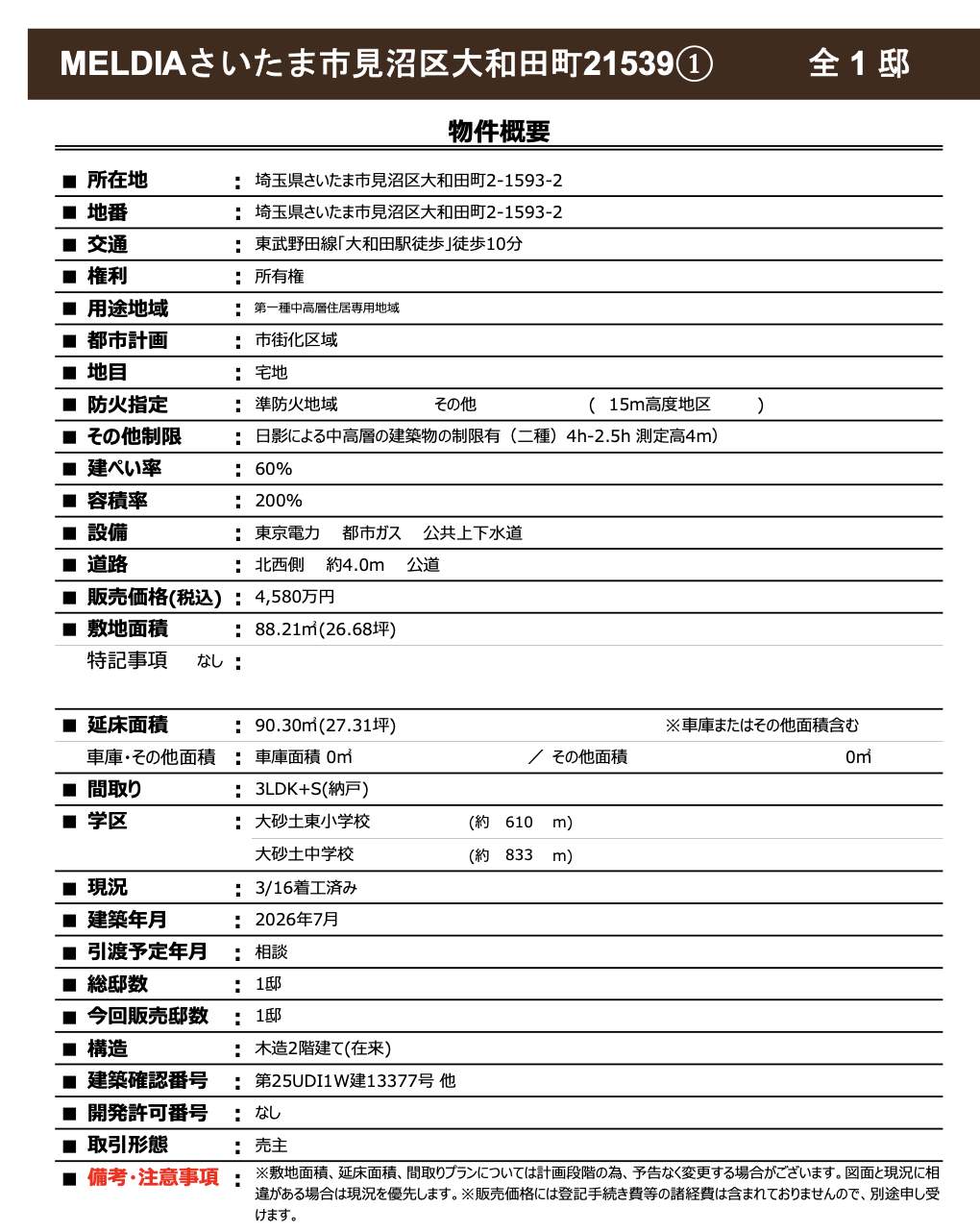 | 所在地 | 埼玉県さいたま市見沼区大和田町2丁目1593-2 新築戸建 仲介手数料無料 4580万円 更にお祝金最大20万円プレゼント付 大和田駅歩10分 |