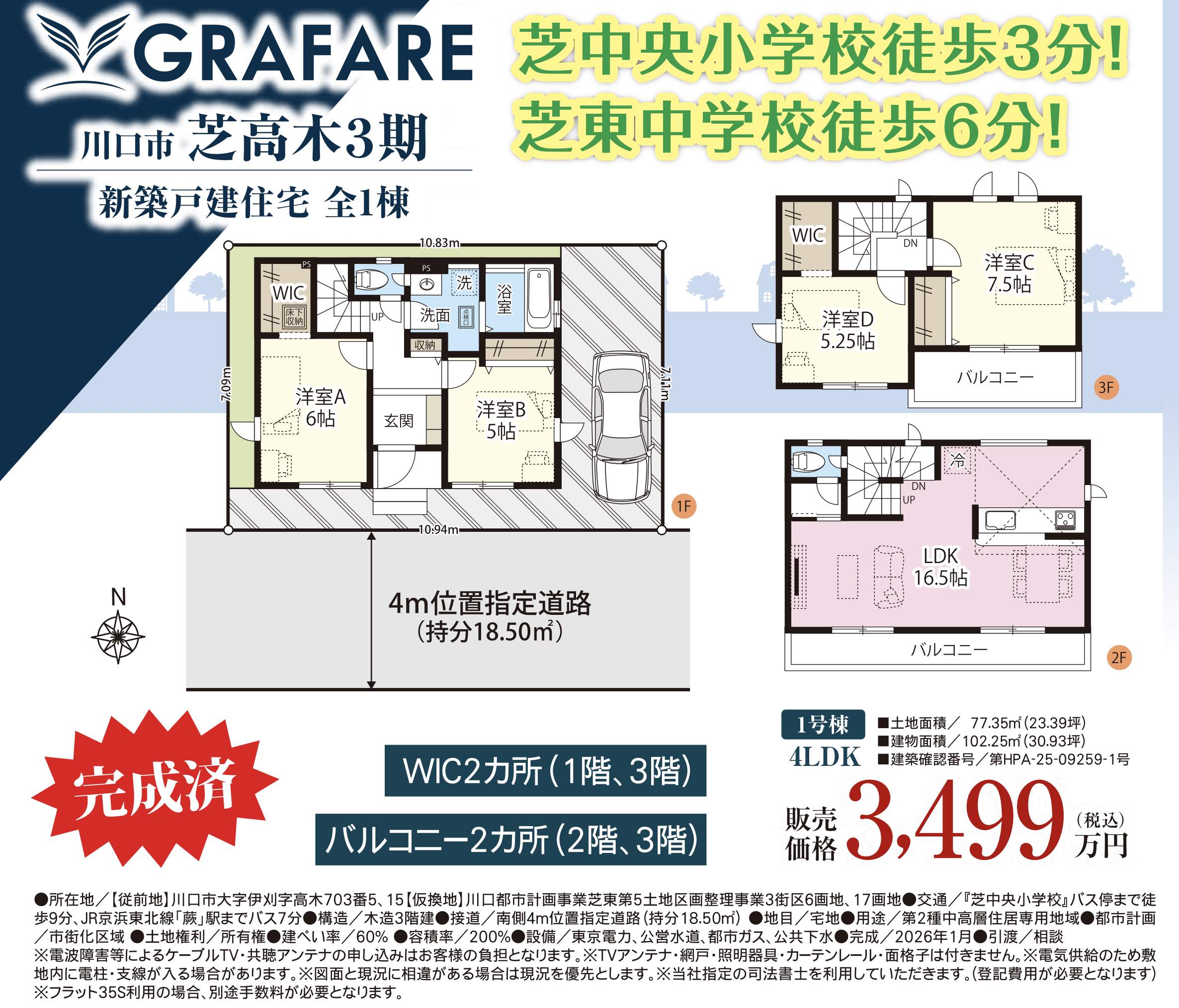 川口市芝高木2丁目 新築戸建 仲介手数料無料 3499万円 更にお祝金最大20万円プレゼント付 蕨駅 バス(芝中央小学校 乗7分 停歩9分) 新築戸建