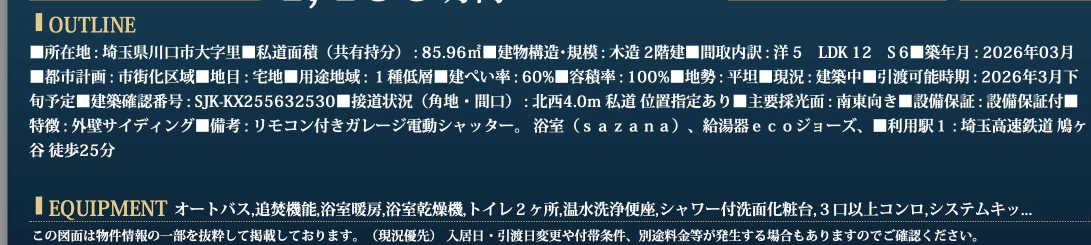 | 所在地 | 埼玉県川口市大字里 新築戸建 仲介手数料無料 4400万円 更にお祝金最大20万円プレゼント付 新井宿駅歩17分 |