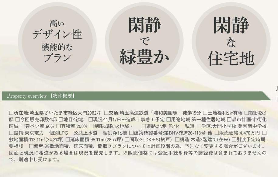 | 所在地 | 埼玉県さいたま市緑区大字大門2987-7 新築戸建 仲介手数料無料 4470万円 更にお祝金最大20万円プレゼント付 浦和美園駅歩15分 |