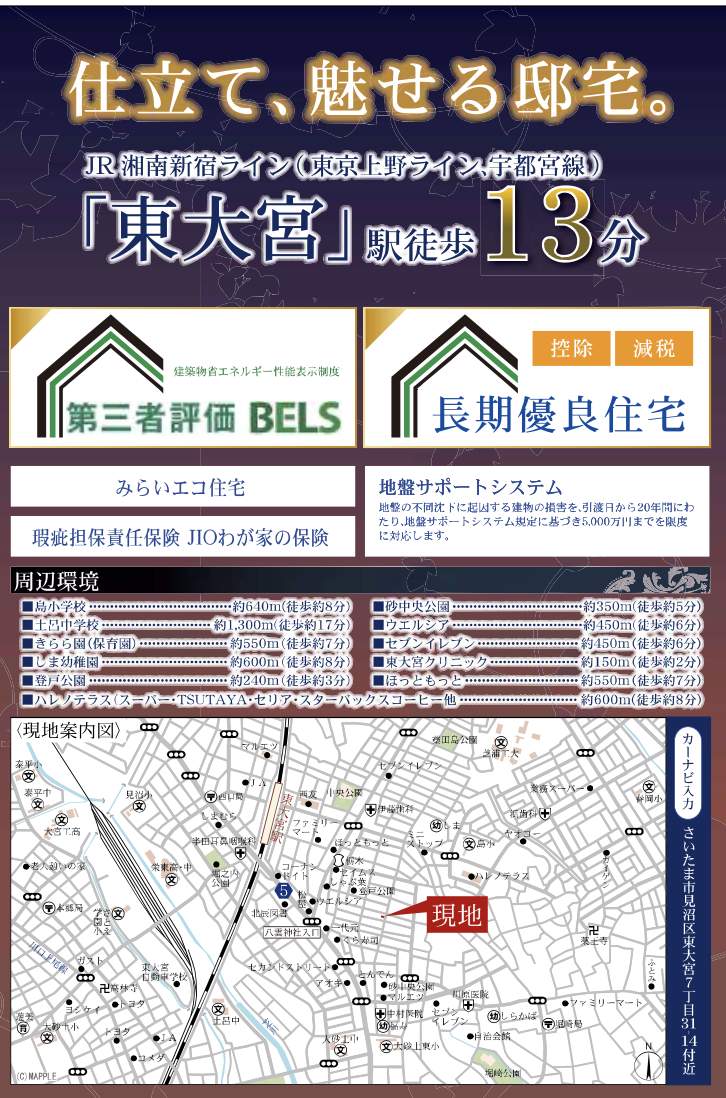 | 所在地 | 埼玉県さいたま市見沼区東大宮7丁目31-14 新築戸建 仲介手数料無料 5580万円 更にお祝金最大20万円プレゼント付 東大宮駅歩13分 |