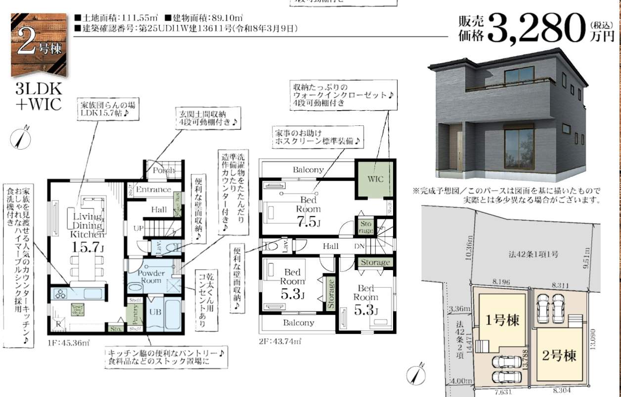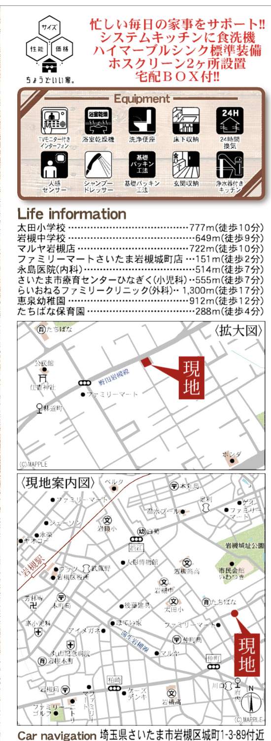 | 所在地 | 埼玉県さいたま市岩槻区城町1丁目3-89 新築戸建 仲介手数料無料 3280万円 更にお祝金最大20万円プレゼント付 岩槻駅歩分 |