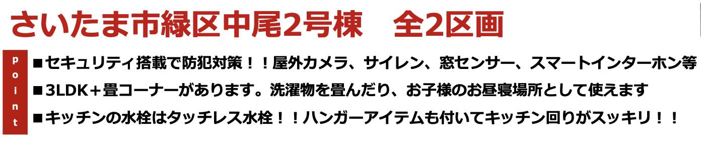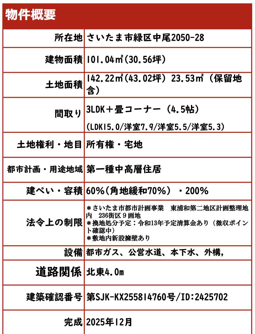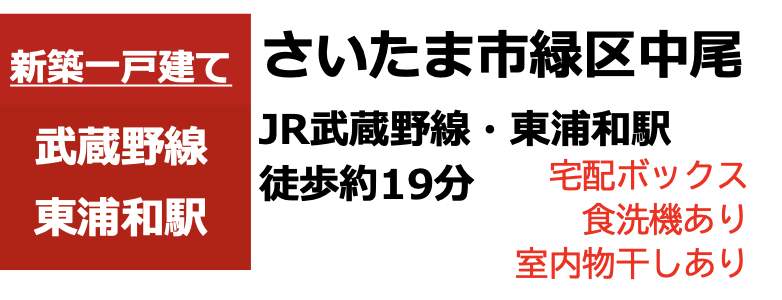 | 所在地 | 埼玉県さいたま市緑区大字中尾2050-28 新築戸建 仲介手数料無料 5180万円 更にお祝金最大20万円プレゼント付 東浦和駅歩19分 |