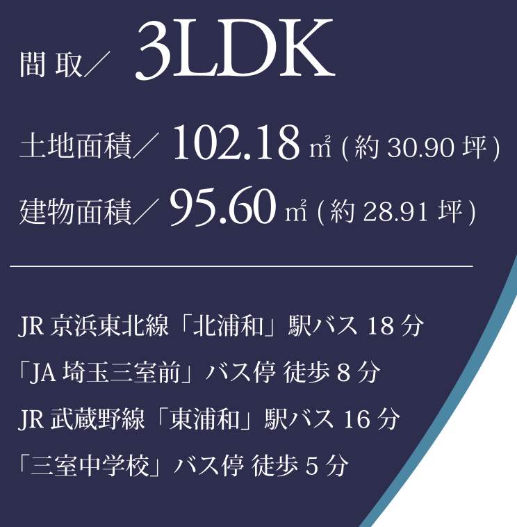 | 交通 | JR京浜東北・根岸線北浦和駅 バス(JA埼玉三室前 乗18分 停歩8分) |