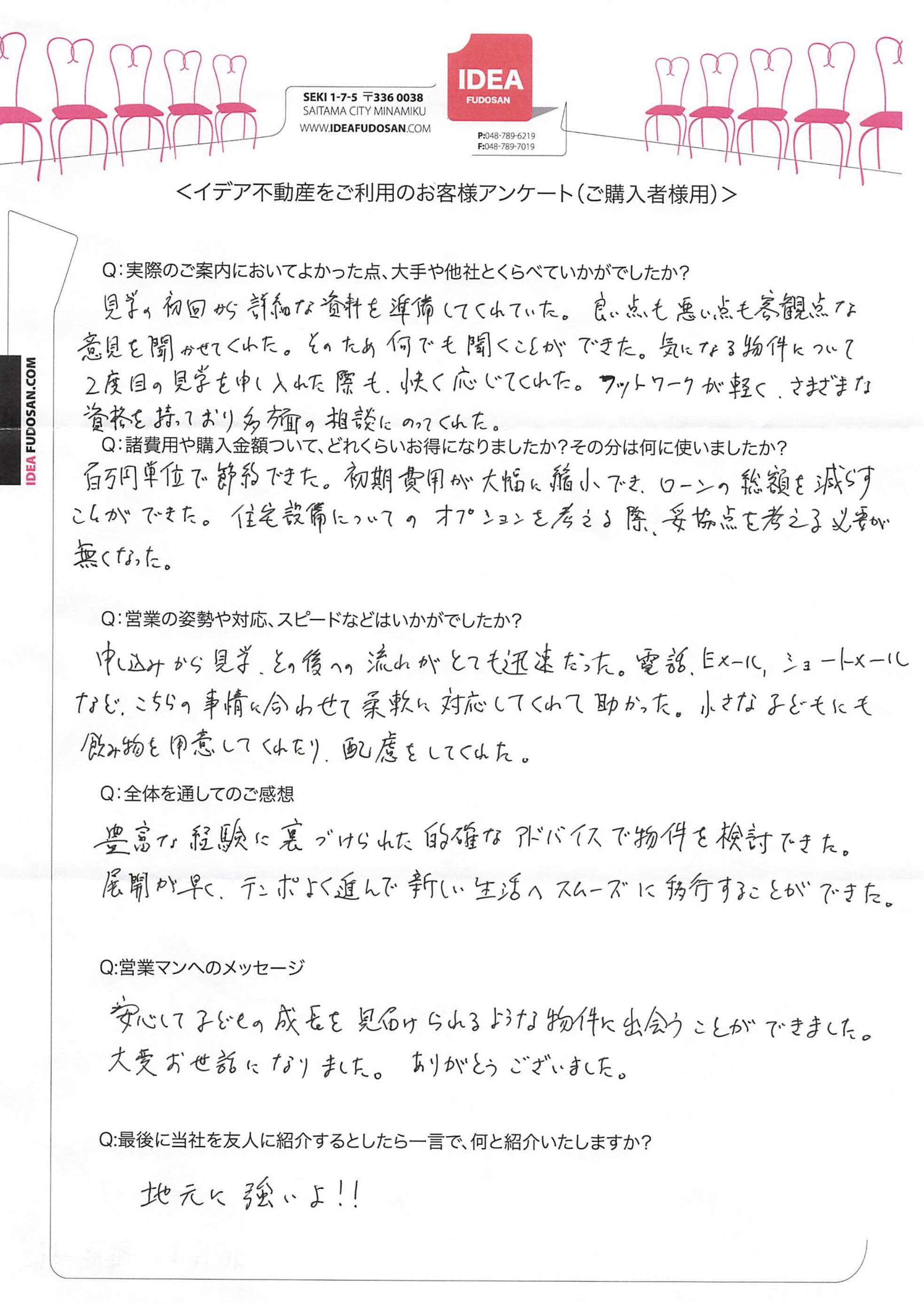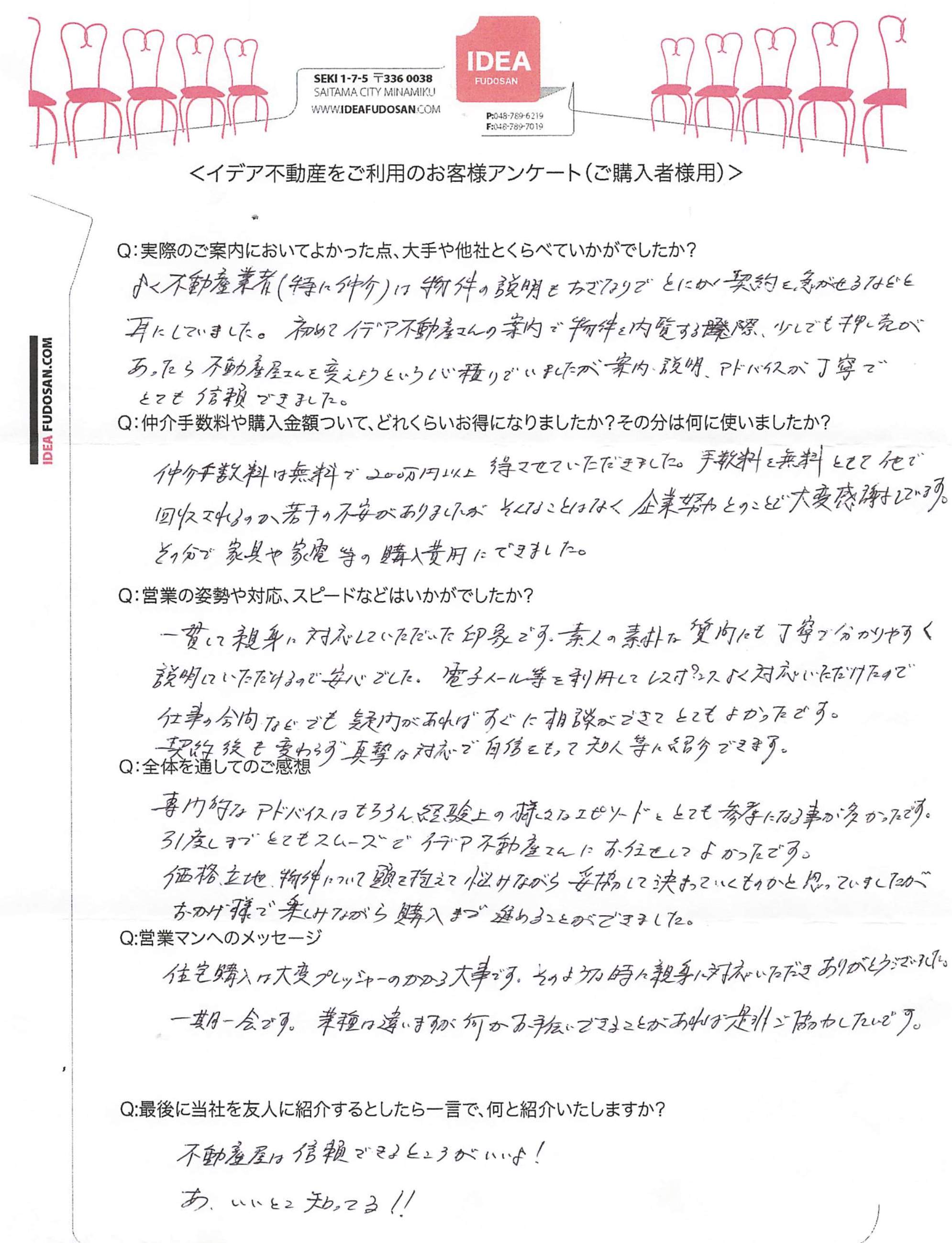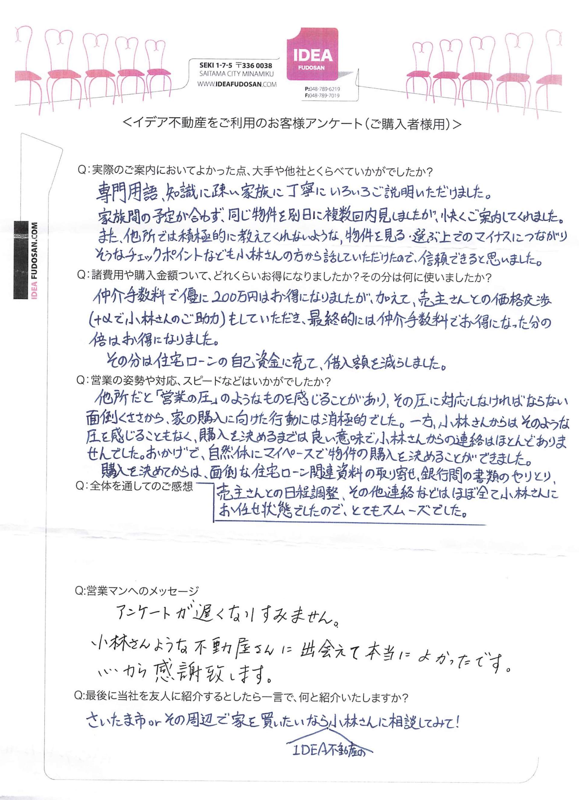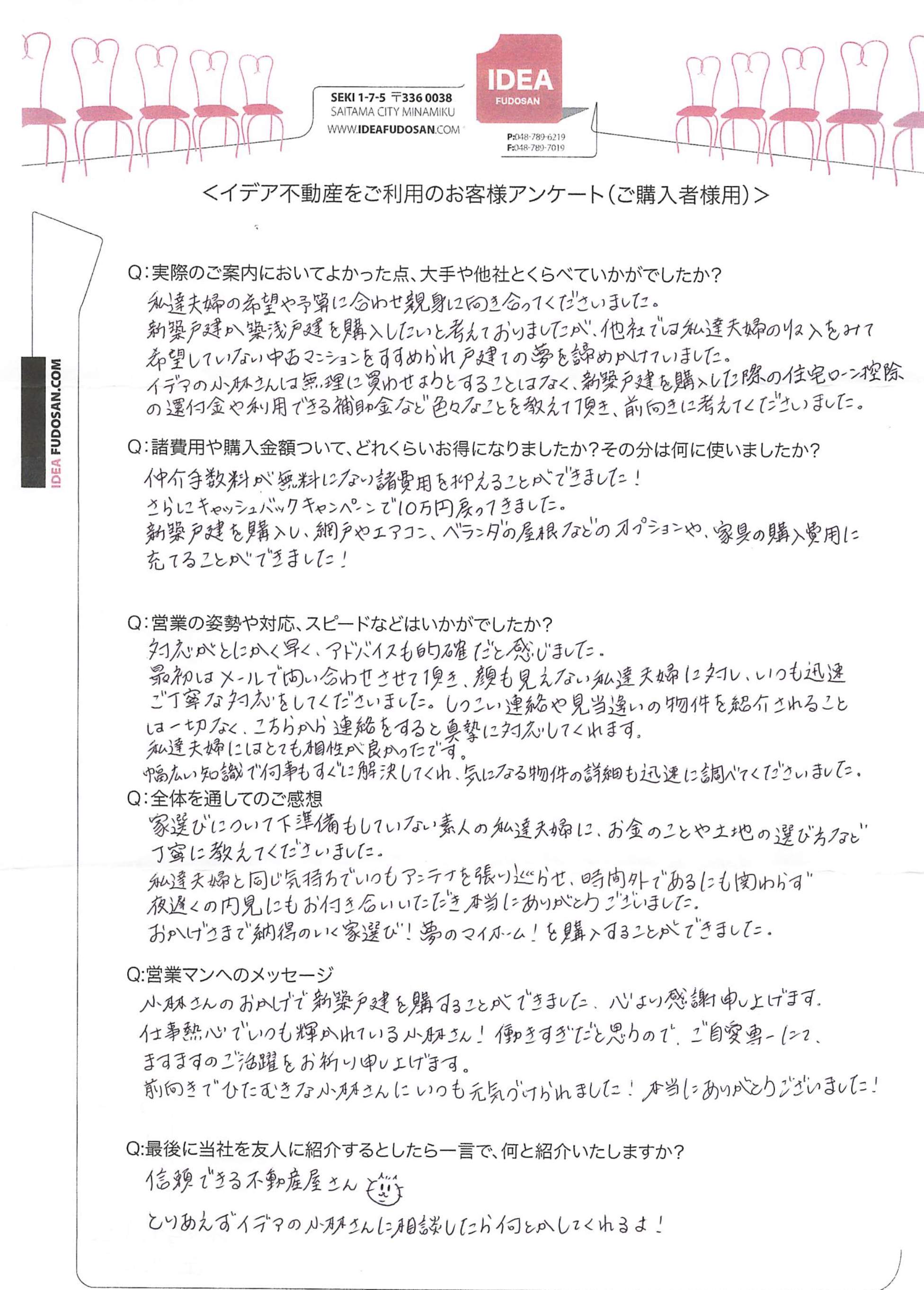 「他社や大手は今まで1回きりの案内で、現地案内等もイマイチですすめてくる物件もミスマッチなものが多かったが、イデアさんは案内もとても丁寧でアフターフォローや物件紹介も希望に沿ったものを提供してくれた。」