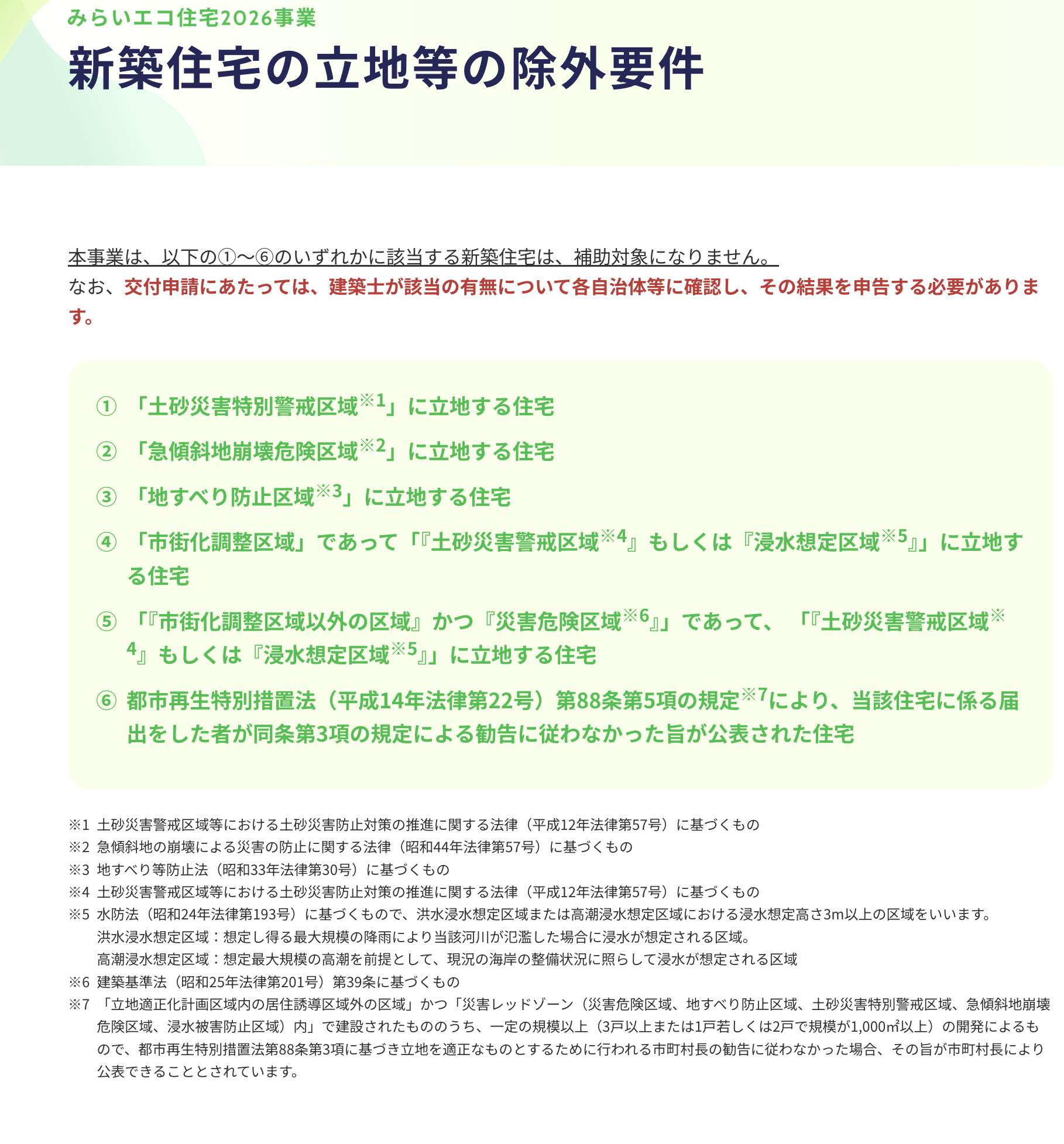 ・ 令和10年以降に入居する場合、土砂災害等の災害レッドゾーン※の新築住宅は適用対象外とする(建替え・既存住宅・リフォームは適用対象)。